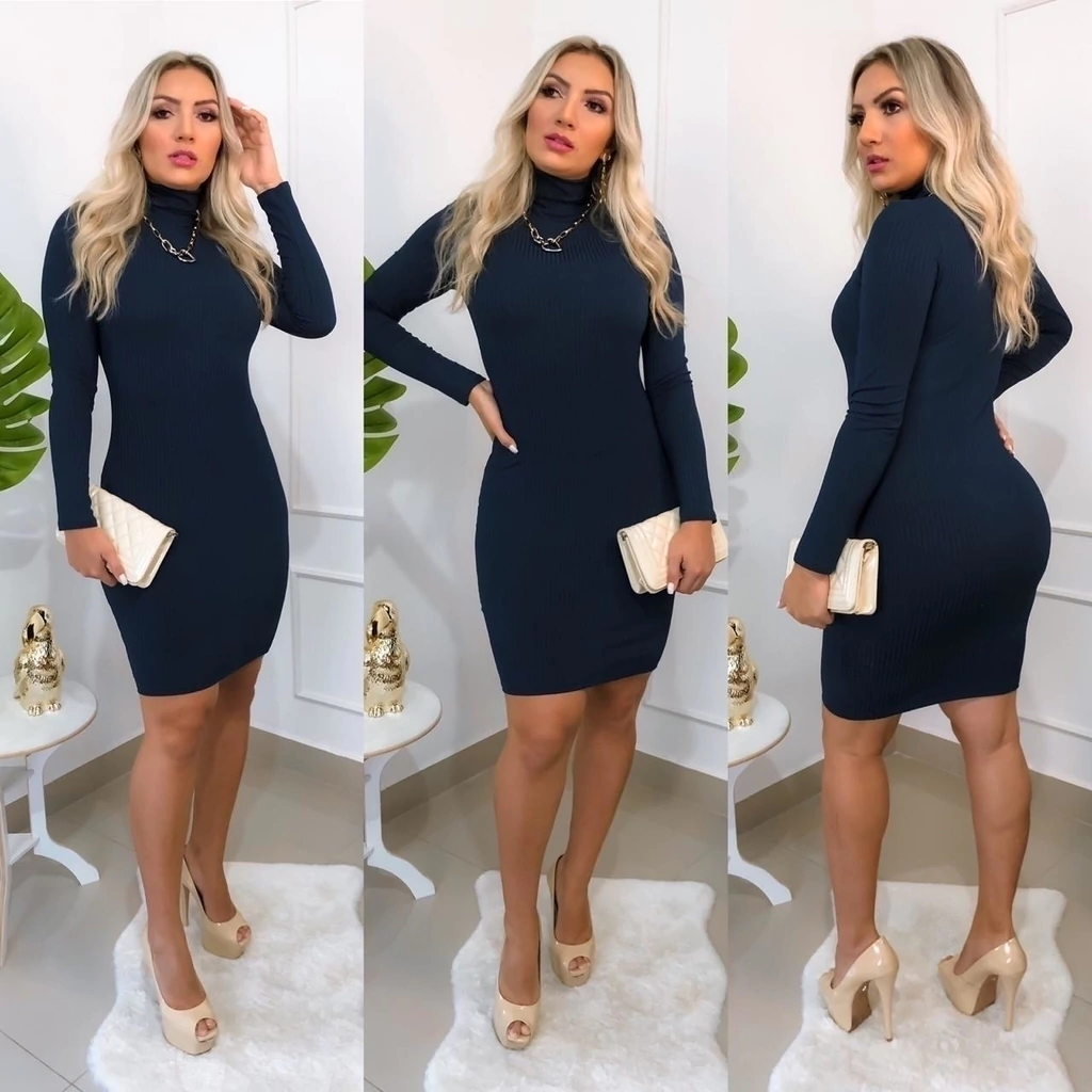 Vestido AZUL PETRÓLEO manga longa gola alta